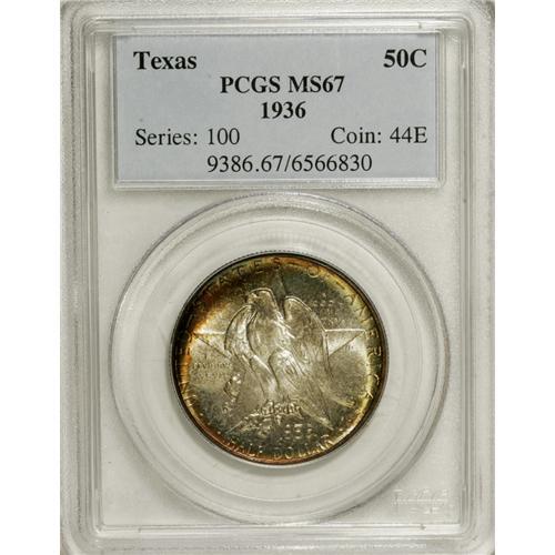 <B>1936 50C Texas MS67 PCGS.</B></I> A highly lustrous and suitably struck Superb Gem example of this classic commemorative. On each side, a ring of rose-influence orange surrounds a soft silver-gray center. PCGS has graded only six coins finer (1/07).<BR><BR><b>Shipping:</b> Coins & Currency (<a target="_blank" href="http://www.heritageauctions.com/common/shipping.php">view shipping information</a>)