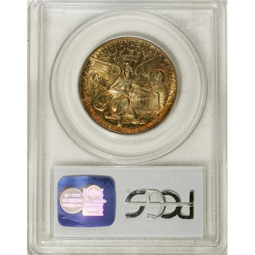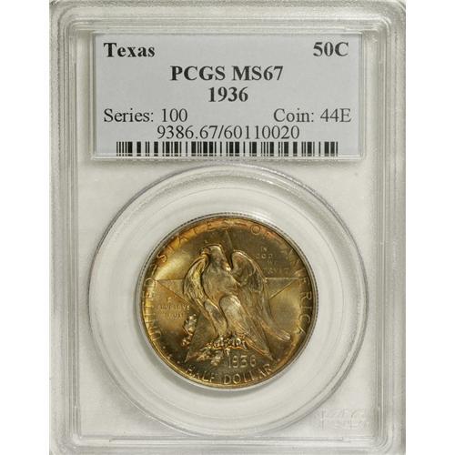 <B>1936 50C Texas MS67 PCGS.</B></I> Beautiful shades of lime-green and gold dominate each side, while the lower areas have magenta elements. An attractive example that was coined in the actual year of the anniversary celebrated. PCGS has graded only six coins finer (4/07).<BR><I>From The Cary & Cheryl Porter Collection.</B></I><BR><BR><b>Shipping:</b> Coins & Currency (<a target="_blank" href="http://www.heritageauctions.com/common/shipping.php">view shipping information</a>)