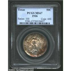 1936 50C Texas MS67 PCGS. Deeply speckled with copper-gold and lime-green patina. A razor-sharp and well preserved Superb Gem that has good luster. Only five coins have been graded higher by PCGS. Important notice: We expect to be auctioning lots at the rate of 200-250 per hour. Sometimes eBay Premier live bid software cannot keep up with that pace, so we strongly recommend that you place a realistic proxy bid now as insurance to avoid disappointment. Also please note that all Heritage/CAA lots purchased through eBay Premier carry a 20% Buyer's Premium. Please make sure you read the Terms and Conditions.