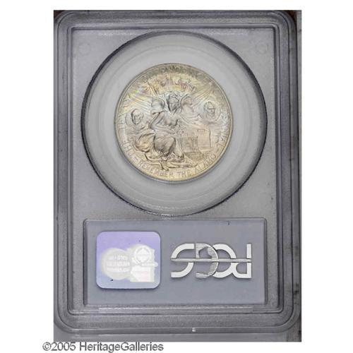 <B>1936<50C> Texas MS67 PCGS.</B></I> Light champagne patina is blended with iridescent yellow, pink, and blue near the top on the reverse.
