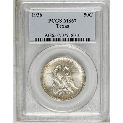 <B>1936<50C> Texas MS67 PCGS.</B></I> Powder-blue and champagne patina adorns both sides of this solidly struck and quite lustrous coin. PCGS has graded only six finer examples (7/06).