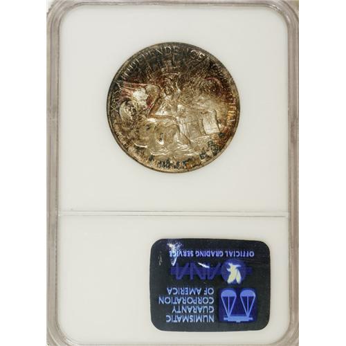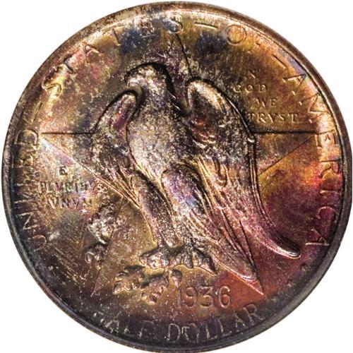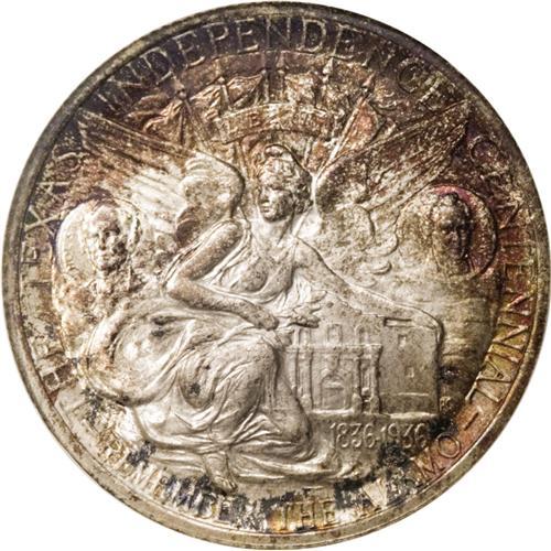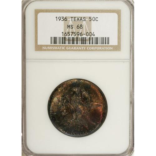<B>1936 50C Texas MS68 NGC.</B></I> Though Cornelius Vermeule admired the Texas design, if for no other reason than its success at incorporating so many elements into one space, many numismatic scholars find the reverse far too chaotic for a half dollar. Nonetheless, most collectors today acknowledge the artistry of the coin. The vivid orange, magenta, and forest-green patina that covers the obverse and much of the reverse generates much of this 1936 example's eye appeal. Glints of brilliance appear beneath silver-gray toning over the lower half of Victory and the Alamo. Neither NGC nor PCGS has graded an MS69 representative (3/07).<BR><I>From The Cary & Cheryl Porter Collection.</B></I><BR><BR><b>Shipping:</b> Coins & Currency (<a target="_blank" href="http://www.heritageauctions.com/common/shipping.php">view shipping information</a>)