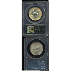 <B>1936<50C> Wisconsin MS65 PCGS,</B></I> splendid rose-tinged borders cede to untoned centers, sharply struck and impressively undisturbed; and a <B>1936 York MS65 PCGS,</B></I> streaks of peach color overlay this unblemished cream-gray Gem. Both coins are housed in prior generation holders. 2 Coins <BR><BR><B>Important notice:</B> Heritage usually auctions material at the rate of 200-250 lots per hour. On some occasions eBay Live bid software or the Internet may not be able to keep up with the pace of the auction. We recommend placing a realistic absentee bid now as insurance to avoid disappointment. Occasionally the auctioneer may eliminate or reject an eBay Live bid, and the auctioneer may also reopen a lot after the close of the eBay live bidding (usually because we missed an audience bid), and may reject your bid even if it shows you as the winning bidder. By bidding via eBay Live, you agree that Heritage may award the lot to another bidder at its sole discretion under the circumstances described above or any other reasonable circumstances. Since eBay bids are not shown to us until we open the lot on the floor, we treat those bids just like floor bids. In most cases the floor responds before the eBay bid is presented to us, due to Internet lag time, so for consistency we have made it a policy that floor bids are always considered first over tie eBay live bids. Also please note that all Heritage lots purchased through eBay Live carry a 20% Buyer's Premium. Please make sure you read the Terms and Conditions before you bid. </span></font></tr></table></td></tr></table>
