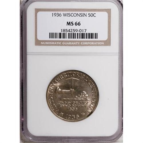 <B>1936 50C Wisconsin MS66 NGC.</B></I> NGC Census: (1128/324). PCGS Population (1324/353). Mintage: 25,015. Numismedia Wsl. Price for NGC/PCGS coin in MS66: $520. (#9447)<BR><I>From The Frank DuVall Collection of U.S. Commemoratives.</B></I><BR><BR><b>Shipping:</b> Coins & Currency (<a target="_blank" href="http://www.heritageauctions.com/common/shipping.php">view shipping information</a>\)