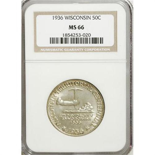 <B>1936 50C Wisconsin MS66 NGC.</B></I> NGC Census: (1128/324). PCGS Population (1324/353). Mintage: 25,015. Numismedia Wsl. Price for NGC/PCGS coin in MS66: $520. (#9447)<BR><I>From The Frank DuVall Collection of U.S. Commemoratives.</B></I><BR><BR><b>Shipping:</b> Coins & Currency (<a target="_blank" href="http://www.heritageauctions.com/common/shipping.php">view shipping information</a>\)