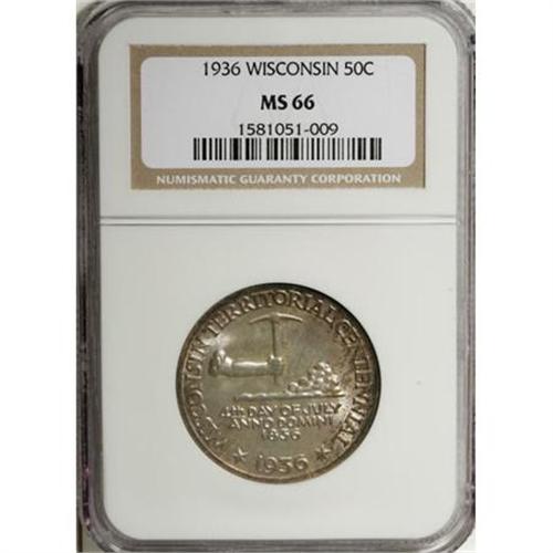 <B>1936 50C Wisconsin MS66 NGC.</B></I> NGC Census: (1138/331). PCGS Population (1343/362). Mintage: 25,015. Numismedia Wsl. Price for NGC/PCGS coin in MS66: $520. (#9447)<BR><BR><b>Shipping:</b> Coins & Currency (<a target="_blank" href="http://www.heritageauctions.com/common/shipping.php">view shipping information</a>)