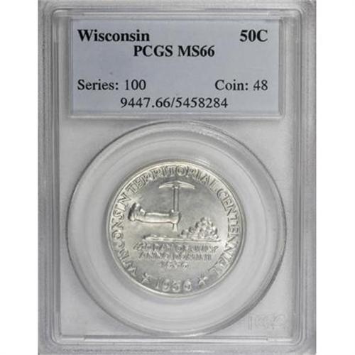 <B>1936 50C Wisconsin MS66 PCGS.</B></I> PCGS Population (1351/366). NGC Census: (1149/336). Mintage: 25,015. Numismedia Wsl. Price for NGC/PCGS coin in MS66: $520. (#9447)<BR><BR><b>Shipping:</b> Coins & Currency (<a target="_blank" href="http://www.heritageauctions.com/common/shipping.php">view shipping information</a>)