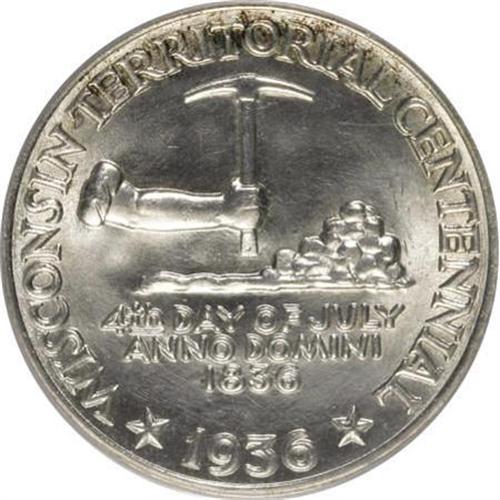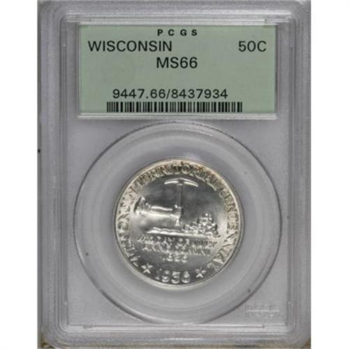 <B>1936 50C Wisconsin MS66 PCGS.</B></I> PCGS Population (1359/369). NGC Census: (1155/340). Mintage: 25,015. Numismedia Wsl. Price for NGC/PCGS coin in MS66: $480. (#9447)<BR><BR><b>Shipping:</b> Coins & Currency (<a target="_blank" href="http://www.heritageauctions.com/common/shipping.php">view shipping information</a>)