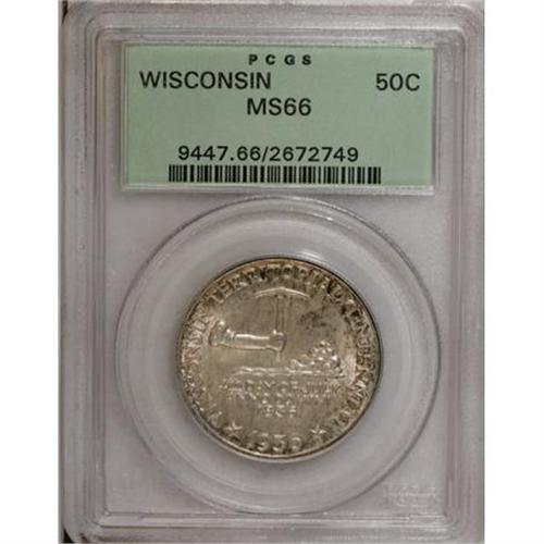 <B>1936 50C Wisconsin MS66 PCGS.</B></I> PCGS Population (1359/369). NGC Census: (1155/340). Mintage: 25,015. Numismedia Wsl. Price for NGC/PCGS coin in MS66: $480. (#9447)<BR><BR><b>Shipping:</b> Coins & Currency (<a target="_blank" href="http://www.heritageauctions.com/common/shipping.php">view shipping information</a>)