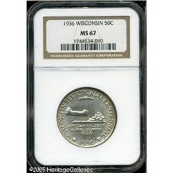 <B>1936 50C Wisconsin MS67 NGC.</B></I> Light ivory color with hints of gold toning over frosty silver luster. Unlike many Superb Gem commemorative issues, this one actually received its grade due to exceptional surfaces. So many others have lesser quality surfaces with the grade assigned due to exceptional toning. Lot:8635