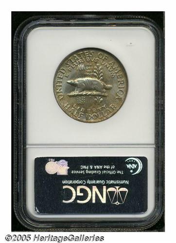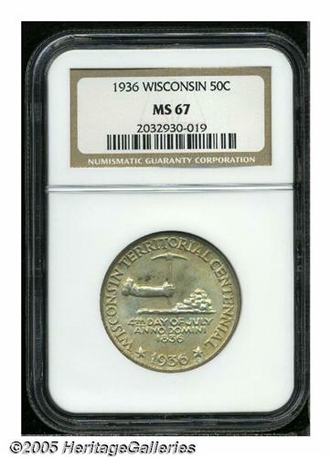 <B>1936<50C> Wisconsin MS67 NGC.</B></I> Wisps of pastel reddish-gold and pastel-blue complement both sides of this satiny and fully detailed Superb Gem. The fields and devices are as free of blemishes as the day that the coin first dropped from the dies. A difficult variety to find any better.<BR><I>From The Clifford Columbus Collection.</B></I>