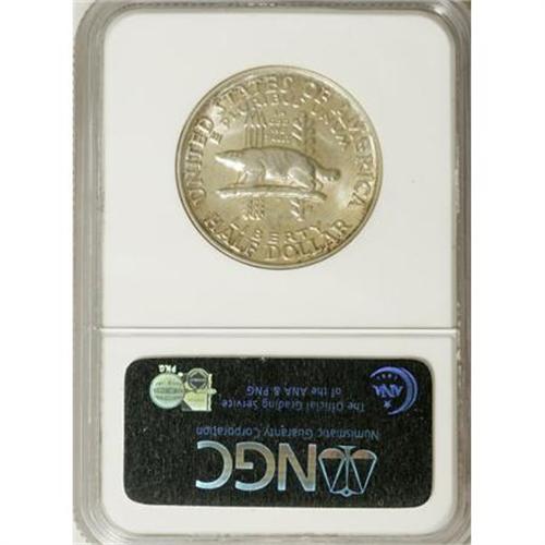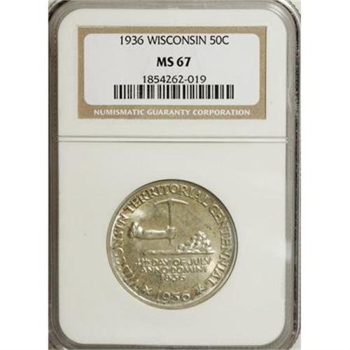 <B>1936 50C Wisconsin MS67 NGC.</B></I> Included with the lot is an insured letter from the State Superintendent of Madison, Wis., postmarked Aug. 26, 1936; and a green-gray holder printed "Dennisons Coin Mailing Card." NGC Census: (308/16). PCGS Population (338/15). Mintage: 25,015. Numismedia Wsl. Price for NGC/PCGS coin in MS67: $850. (#9447)<BR><I>From The Frank DuVall Collection of U.S. Commemoratives.</B></I><BR><BR><b>Shipping:</b> Coins & Currency (<a target="_blank" href="http://www.heritageauctions.com/common/shipping.php">view shipping information</a>\)
