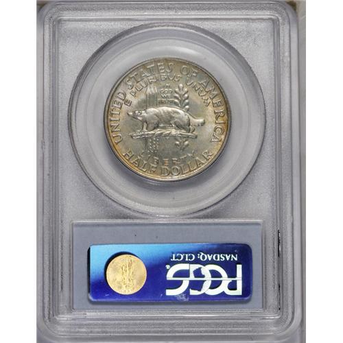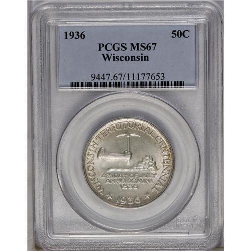 <B>1936<50C> Wisconsin MS67 PCGS.</B></I> Highly lustrous surfaces display speckles of olive-green on the obverse and low intensity multicolored toning on the reverse. Sharply defined, with no mentionable abrasions.