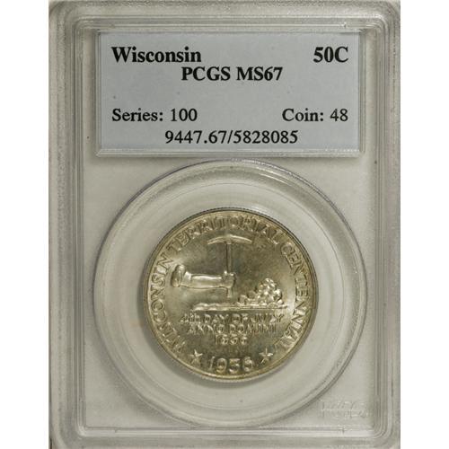 <B>1936 50C Wisconsin MS67 PCGS.</B></I> Highly lustrous with a touch of golden-gray patina in the fields. Each side displays only a touch of the softness that so often affects this issue.<BR><BR><b>Shipping:</b> Coins & Currency (<a target="_blank" href="http://www.heritageauctions.com/common/shipping.php">view shipping information</a>)