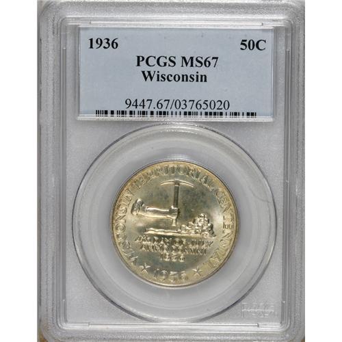 <B>1936 50C Wisconsin MS67 PCGS.</B></I> Honey-gold and ice-blue toning endow this lustrous and exceptionally preserved Superb Gem. A charming representative of this territorial centennial issue.<BR><BR><b>Shipping:</b> Coins & Currency (<a target="_blank" href="http://www.heritageauctions.com/common/shipping.php">view shipping information</a>)