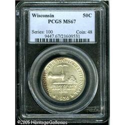 <B>1936 50C Wisconsin MS67 PCGS.</B></I> Rich rose and golden-brown colors grace the left border of this lustrous and attractively preserved Superb Gem. As of (1/05), a scant 13 pieces have been certified higher by PCGS. Lot:8634