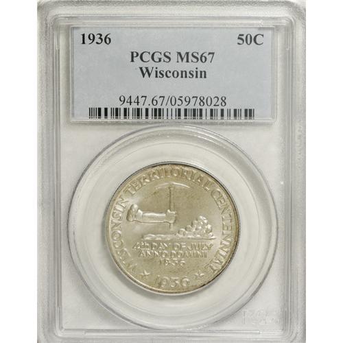 <B>1936 50C Wisconsin MS67 PCGS.</B></I> Subtly lustrous with suitable detail. Each side of this surprisingly well-preserved Superb Gem displays attractive blue-gray patina.<BR><BR><b>Shipping:</b> Coins & Currency (<a target="_blank" href="http://www.heritageauctions.com/common/shipping.php">view shipping information</a>)