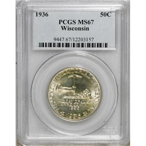 <B>1936 50C Wisconsin MS67 PCGS.</B></I> . PCGS Population (350/16). NGC Census: (323/16). Mintage: 25,015. Numismedia Wsl. Price for NGC/PCGS coin in MS67: $850. (#9447)<BR><BR><b>Shipping:</b> Coins & Currency (<a target="_blank" href="http://www.heritageauctions.com/common/shipping.php">view shipping information</a>)
