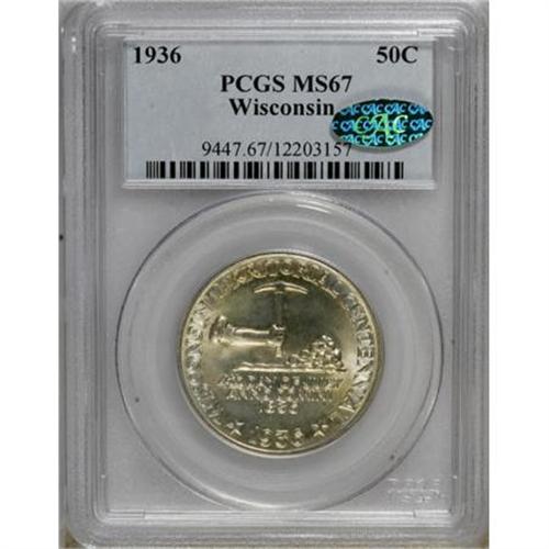 <B>1936 50C Wisconsin MS67 PCGS. CAC.</B></I> Both sides of this enchanting Wisconsin half dollar display brilliant silver surfaces that are accented with lemon yellow and faint olive on both sides. It is essentially a flawless Superb Gem that will please any collector.<BR><BR><b>Shipping:</b> Coins & Currency (<a target="_blank" href="http://www.heritageauctions.com/common/shipping.php">view shipping information</a>)