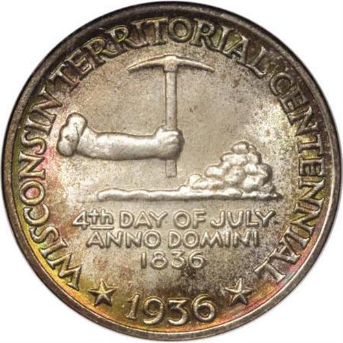 <B>1936 50C Wisconsin MS68 <img border='0' src='http://www.heritagecoins.com/images/star.gif' width=10 height=10> NGC.</B></I> The pearl-gray centers are framed by splendid rose-red and forest-green toning. The strike is meticulous, and even close examination with a loupe fails to locate contact. A fully original Superb Gem worthy of the finest collection. Population: 5 in 68 S, none finer at either service (6/07). <BR><I>From The Cary & Cheryl Porter Collection, Part Three.</B></I><BR><BR><b>Shipping:</b> Coins & Currency (<a target="_blank" href="http://www.heritageauctions.com/common/shipping.php">view shipping information</a>\)