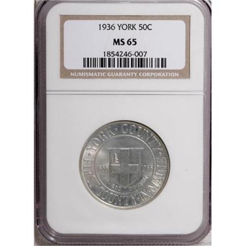 <B>1936 50C York MS65 NGC.</B></I> NGC Census: (930/1487). PCGS Population (1730/1765). Mintage: 25,015. Numismedia Wsl. Price for NGC/PCGS coin in MS65: $260. (#9449)<BR><I>From The Frank DuVall Collection of U.S. Commemoratives.</B></I><BR><BR><b>Shipping:</b> Coins & Currency (<a target="_blank" href="http://www.heritageauctions.com/common/shipping.php">view shipping information</a>\)