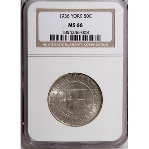 <B>1936 50C York MS66 NGC.</B></I> NGC Census: (1107/380). PCGS Population (1265/500). Mintage: 25,015. Numismedia Wsl. Price for NGC/PCGS coin in MS66: $460. (#9449)<BR><I>From The Frank DuVall Collection of U.S. Commemoratives.</B></I><BR><BR><b>Shipping:</b> Coins & Currency (<a target="_blank" href="http://www.heritageauctions.com/common/shipping.php">view shipping information</a>\)