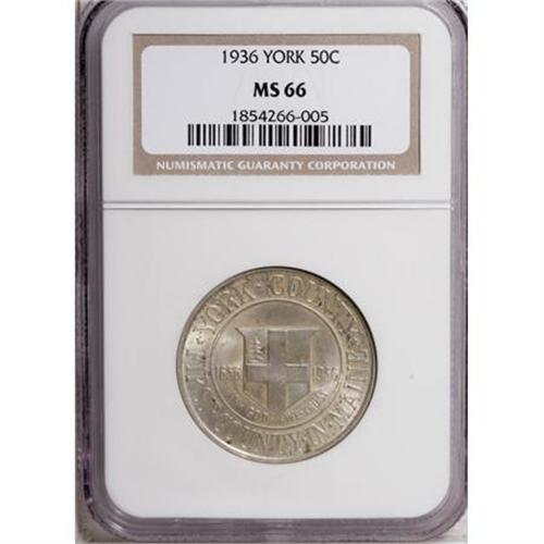 <B>1936 50C York MS66 NGC.</B></I> NGC Census: (1107/380). PCGS Population (1265/500). Mintage: 25,015. Numismedia Wsl. Price for NGC/PCGS coin in MS66: $460. (#9449)<BR><I>From The Frank DuVall Collection of U.S. Commemoratives.</B></I><BR><BR><b>Shipping:</b> Coins & Currency (<a target="_blank" href="http://www.heritageauctions.com/common/shipping.php">view shipping information</a>\)