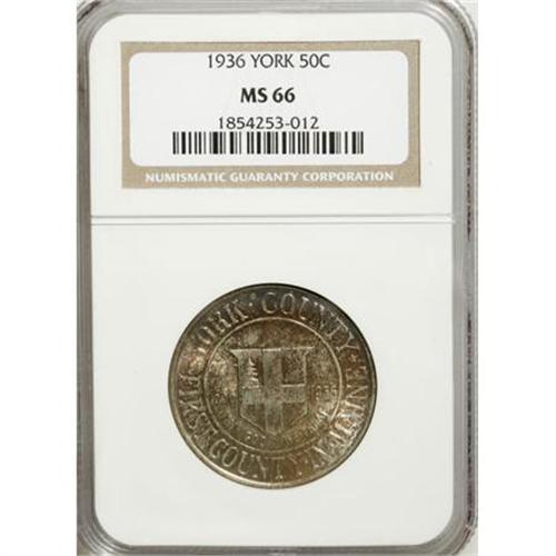 <B>1936 50C York MS66 NGC.</B></I> NGC Census: (1107/380). PCGS Population (1265/500). Mintage: 25,015. Numismedia Wsl. Price for NGC/PCGS coin in MS66: $460. (#9449)<BR><I>From The Frank DuVall Collection of U.S. Commemoratives.</B></I><BR><BR><b>Shipping:</b> Coins & Currency (<a target="_blank" href="http://www.heritageauctions.com/common/shipping.php">view shipping information</a>\)