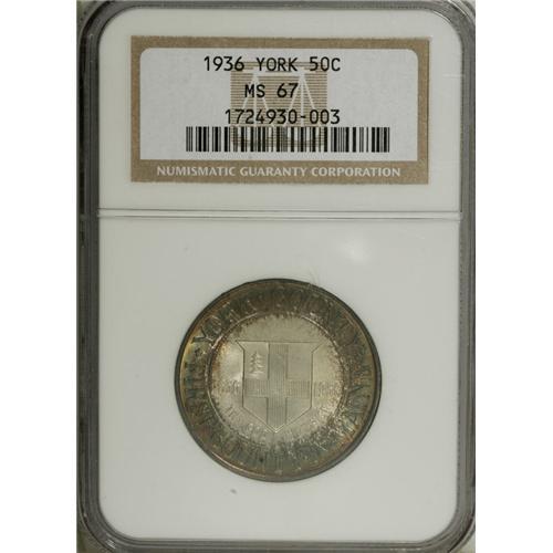 <B>1936 50C York MS67 NGC.</B></I> A highly lustrous and well-defined example of this local-interest issue. The obverse's outer ring has greenish-blue and gold patina, while the reverse periphery is plum-hued. Both sides have untoned centers.<BR><BR><b>Shipping:</b> Coins & Currency (<a target="_blank" href="http://www.heritageauctions.com/common/shipping.php">view shipping information</a>)