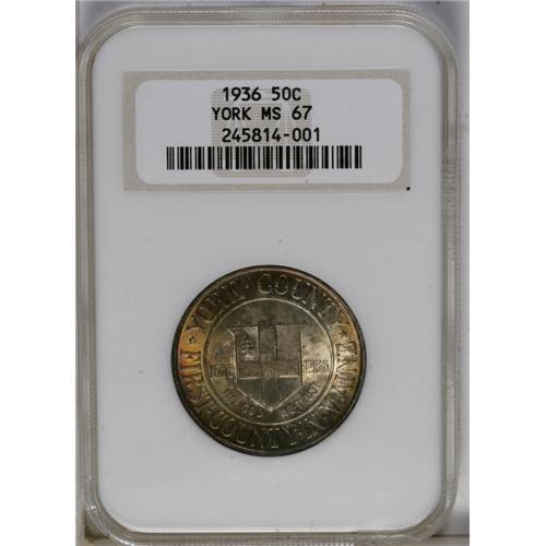 <B>1936<50C> York MS67 NGC.</B></I> A lovely Superb Gem toned gold and magenta. This piece has the full luster, bold strike, and minimal marks one would expect of a coin so well preserved.