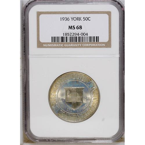 <B>1936 50C York MS68 NGC.</B></I> A magnificent example of this popular commemorative issue, struck to celebrate the 300th anniversary of the founding of York County, Maine. The striking details are superb, and a blazing semi-prooflike sheen erupts from each side of the coin. Gold, sky-blue, and terra cotta toning further enhances the eye appeal of this pristine piece. Census: 26 in 68, 0 finer (11/06).<BR><BR><b>Shipping:</b> Coin/Currency (<a target="_blank" href="http://www.heritageauctions.com/common/shipping.php">view shipping information</a>)