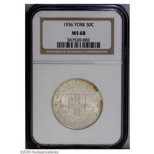 <B>1936<50C> York MS68 NGC.</B></I> This is an absolutely stunning Superb Gem example with brilliant and natural silver surfaces and wisps of gold toning on the right obverse border. A couple small grayish planchet flaws on the reverse rim appear to be as made. Population: 16 in 68, 0 finer (10/05).