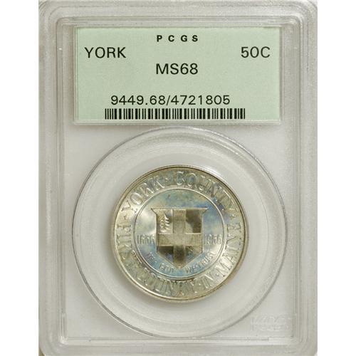 <B>1936 50C York MS68 PCGS.</B></I> Who was Walter H. Rich? His only design credit was the York half, and Q. David Bowers (1991) could describe him only as "a Portland, Maine artist known in particular for his drawings of wildlife and nature." Further research through Project Gutenberg turns up a Walter H. Rich in the employ of the United States Department of Commerce, Bureau of Fisheries, as the author of the fiscal year 1929 monograph "Fishing Grounds of the Gulf of Maine," a treatise on the seafood sources of New England and nearby Canada. Between the name, identical to the middle initial; the timeframe, with only seven years between the monograph and the artwork; and the placement of civil servant Rich in a job that brought him into regular contact with the outdoors, one can make a strong case that the writer and the artist are one and the same.<BR> Hazy golden patina covers much of the obverse of this wonderfully well-preserved representative, while the reverse is mostly brilliant. Any attempt to find a single offensive mark is futile. NGC has certified no numerically finer examples, and this piece is tied for the finest graded by PCGS (4/07).<BR><I>From The Cary & Cheryl Porter Collection.</B></I><BR><BR><b>Shipping:</b> Coins & Currency (<a target="_blank" href="http://www.heritageauctions.com/common/shipping.php">view shipping information</a>)