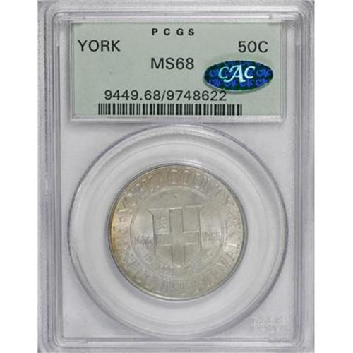 <B>1936 50C York MS68 PCGS. CAC.</B></I> Orange and lilac patina bathes the obverse of this breathtaking commemorative, while wisps of red, tan, green and gray ride over the reverse. A powerful strike emboldens the design features, and the highly lustrous surfaces are near pristine. Housed in a green-label holder. Population: 21 in 68, 0 finer (12/07).<BR><BR><b>Shipping:</b> Coins & Currency (<a target="_blank" href="http://www.heritageauctions.com/common/shipping.php">view shipping information</a>)