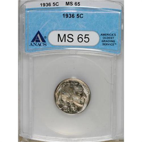 <B>1936 5C MS65 ANACS.</B></I> NGC Census: (698/825). PCGS Population (1680/980). Mintage: 119,001,424. Numismedia Wsl. Price for NGC/PCGS coin in MS65: $81. (#3977)<BR><BR><b>Shipping:</b> Coins & Currency (<a target="_blank" href="http://www.heritageauctions.com/common/shipping.php">view shipping information</a>)