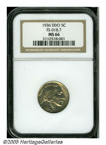 <B>1936<5C> MS66 Doubled Die Obverse NGC.</B></I> FS-018.7. A brilliant Premium Gem with light gold and iridescent toning over fully lustrous surfaces. This variety is described by Bill Fivaz and J.T. Stanton as "the strongest known Class VI doubled die obverse for the series." Doubling is mostly apparent as extreme thickness on letters of LIBERTY. Population: 2 in 66, 0 finer (3/05).