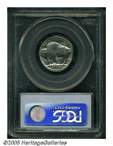 <B>1936<5C> MS67 PCGS.</B></I> A thin veneer of ice-blue and beige patina occupies the obverse, while the reverse is covered by faint beige-gold toning. The surfaces are well preserved with no mentionable marks, and radiate dazzling luster. The highest mintage Buffalo Nickel is surprisingly difficult at this outstanding grade level. Not a single finer example has been certified by PCGS. Population: 60 in 67, 0 finer (4/05).