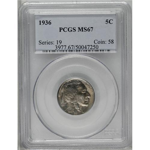 <B>1936<5C> MS67 PCGS.</B></I> Boasting rich satin luster and nearly full striking details, this exquisitely preserved Superb Gem also has amazingly clean surfaces on each side. The standard gray coloration is augmented on both obverse and reverse by pleasing golden accents. Population: 70 in 67, 0 finer (3/06).<BR><I>From The Alex & Nan Registry Sets.</B></I> <BR><BR><B>Important notice:</B> Heritage usually auctions material at the rate of 200-250 lots per hour. On some occasions eBay Live bid software or the Internet may not be able to keep up with the pace of the auction. We recommend placing a realistic absentee bid now as insurance to avoid disappointment. Occasionally the auctioneer may eliminate or reject an eBay Live bid, and the auctioneer may also reopen a lot after the close of the eBay live bidding (usually because we missed an audience bid), and may reject your bid even if it shows you as the winning bidder. By bidding via eBay Live, you agree that Heritage may award the lot to another bidder at its sole discretion under the circumstances described above or any other reasonable circumstances. Since eBay bids are not shown to us until we open the lot on the floor, we treat those bids just like floor bids. In most cases the floor responds before the eBay bid is presented to us, due to Internet lag time, so for consistency we have made it a policy that floor bids are always considered first over tie eBay live bids. Also please note that all Heritage lots purchased through eBay Live carry a 20% Buyer's Premium. Please make sure you read the Terms and Conditions before you bid. This lot is being auctioned in conjunction with a live floor auction by Heritage Galleries & Auctioneers. All final auction and invoice information will be supplied by Heritage Galleries & Auctioneers, and all other information should be considered preliminary. Lot:1123 <BR><BR><B>Winning Notification and Billing:</B> After the FINAL session in this auction is complete, Heritage will send e-mail and snail mail invoices. This process normally takes several days. All final auction and invoice information will be supplied by Heritage Galleries & Auctioneers, and all other information should be considered preliminary. <BR><BR>This auction will be conducted on a live auction floor and over the Internet through eBay Live. If you choose to place an absentee bid, please take a moment to <font color='#0000ff'><u><a href='http://pages.ebay.com/liveauctions/help/before/laabsentee.html'>learn how eBay Live absentee bidding works</a></u></font><font color='#000000'>