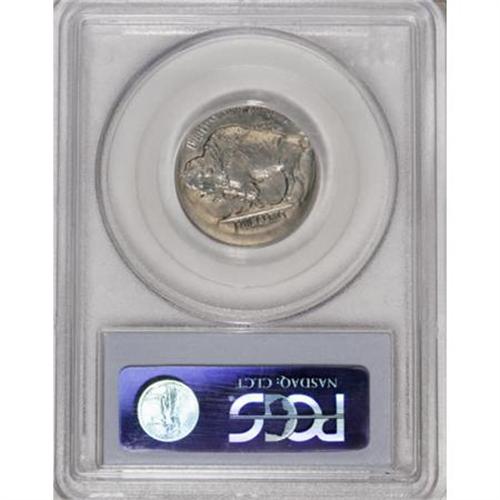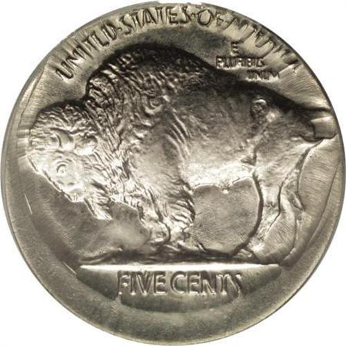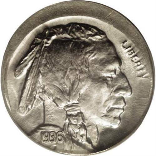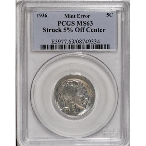 <B>1936 5C --Struck 5% Off-Center--MS63 PCGS.</B></I> A pleasingly detailed, faintly abraded example of this generally available Philadelphia issue. What makes this coin remarkable is its off-center status, a small shift toward 6 o'clock on the obverse, that has left a noticeable unstruck crescent at the upper obverse and lower reverse. The surfaces are largely nickel-gray, though dots of olive visit the fields around the bison.<BR><BR><B>Coin Engraver:</B> James E. Fraser<BR><BR><b>Shipping:</b> Coins & Currency (<a target="_blank" href="http://www.heritageauctions.com/common/shipping.php">view shipping information</a>)