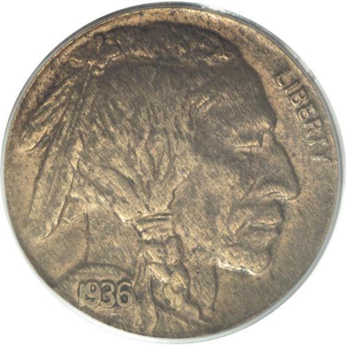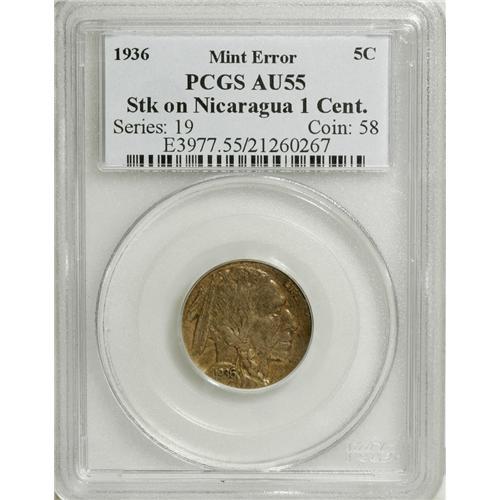 <B>1936 5C Buffalo Nickel--Struck on a Nicaragua Cent Planchet--AU55 PCGS.</B></I> As the U.S. Mint grew in prominence, it took on coinage contracts for other nations, particularly Western Hemisphere nations. Occasionally, planchets intended for a foreign country ended up in presses stamping American coins, and these foreign-planchet errors are prized by collectors today. This caramel-brown example displays violet accents and a slight woodgrain pattern on the reverse. Modestly worn with solid definition everywhere but the highpoints; while there was not enough metal to fill the space between the dies, the softer bronze metal allowed for a deeper impression at the areas of lower relief.<BR><I>From The Pacific Coast Mint Error Collection.</B></I><BR><BR><b>Shipping:</b> Coins & Currency (<a target="_blank" href="http://www.heritageauctions.com/common/shipping.php">view shipping information</a>)