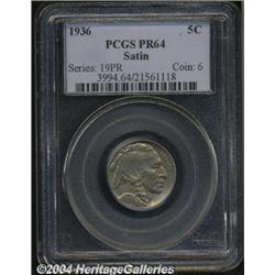 <B>1936<5C> Type One--Satin Finish PR64 PCGS.</B></I> The obverse is mostly light-gold with a splash of sky-blue in the central area of the obverse, while the reverse is mostly pale-violet with splashes of orange and lilac. Strong design detail is found throughout. The satiny surfaces reveal a few carbon spots, which account for the grade.<BR><I>From The Barry Donnell Collection.</B></I> <BR><BR><B>Important notice:</B> Heritage usually auctions material at the rate of 200-250 lots per hour. On some occasions eBay Live bid software or the Internet may not be able to keep up with the pace of the auction. We recommend placing a realistic absentee bid now as insurance to avoid disappointment. Occasionally the auctioneer may eliminate or reject an eBay Live bid, and the auctioneer may also reopen a lot after the close of the eBay live bidding (usually because we missed an audience bid), and may reject your bid even if it shows you as the winning bidder. By bidding via eBay Live, you agree that Heritage may award the lot to another bidder at its sole discretion under the circumstances described above or any other reasonable circumstances. Since eBay bids are not shown to us until we open the lot on the floor, we treat those bids just like floor bids. In most cases the floor responds before the eBay bid is presented to us, due to Internet lag time, so for consistency we have made it a policy that floor bids are always considered first over tie eBay live bids. Also please note that all Heritage lots purchased through eBay Live carry a 20% Buyer's Premium. Please make sure you read the Terms and Conditions before you bid.