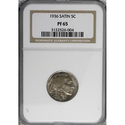 <B>1936 5C Type One--Satin Finish PR65 NGC.</B></I> The earlier satin proof finish met with criticism from collectors, and the Mint soon reverted to the brilliant finish that was remembered and prized from earlier eras. This exquisitely struck Gem offers subtle luster beneath elegant rose, violet, and orange shadings.<BR><BR><b>Shipping:</b> Coins & Currency (<a target="_blank" href="http://www.heritageauctions.com/common/shipping.php">view shipping information</a>)