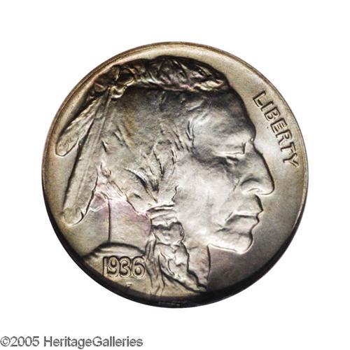 <B>1936<5C> Type One--Satin Finish PR66 NGC.</B></I> An attractively toned and carbonless example of this scarce and widely misunderstood proof finish, which is only seen on a part of the 1936 delivery of 4,420 pieces. The fully detailed surfaces appear free from any post-striking defects and the satiny luster has a silky texture that is most appealing. The fully original surfaces are augmented by multicolored "oil slick" iridescence on the obverse, the reverse is a muted gray-golden color.