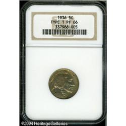 1936 5C Type One--Satin Finish PR66 NGC. Beautiful <B>1936 5C Type One--Satin Finish PR66 NGC.</B></I> Beautiful apricot and powder-blue colors endow this exquisitely struck and lovingly preserved premium Gem. The only Satin Finish issue of the type. <BR><BR><B>Important notice:</B> Heritage usually auctions material at the rate of 200-250 lots per hour. On some occasions eBay Live bid software or the Internet may not be able to keep up with the pace of the auction. We recommend placing a realistic absentee bid now as insurance to avoid disappointment. Occasionally the auctioneer may eliminate or reject an eBay Live bid, and the auctioneer may also reopen a lot after the close of the eBay live bidding (usually because we missed an audience bid), and may reject your bid even if it shows you as the winning bidder. By bidding via eBay Live, you agree that Heritage may award the lot to another bidder at its sole discretion under the circumstances described above or any other reasonable circumstances. Since eBay bids are not shown to us until we open the lot on the floor, we treat those bids just like floor bids. In most cases the floor responds before the eBay bid is presented to us, due to Internet lag time, so for consistency we have made it a policy that floor bids are always considered first over tie eBay live bids. Also please note that all Heritage lots purchased through eBay Live carry a 20% Buyer's Premium. Please make sure you read the Terms and Conditions before you bid. This lot is being auctioned in conjunction with a live floor auction by Heritage Galleries & Auctioneers. All final auction and invoice information will be supplied by Heritage Galleries & Auctioneers, and all other information should be considered preliminary. Lot:5620