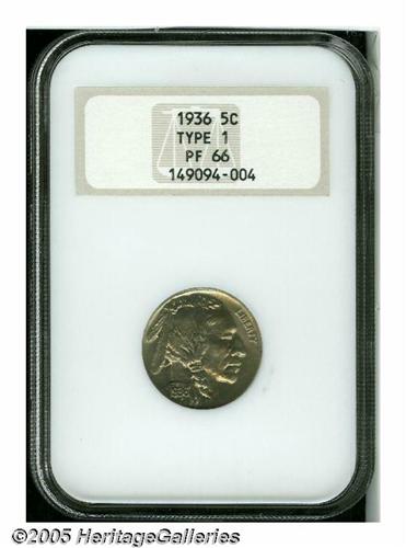 <B>1936<5C> Type One--Satin Finish PR66 NGC.</B></I> Well preserved surfaces reveal warm champagne, lavender, and sky-blue color. The design features are sharply impressed throughout. This coin has a great deal of eye appeal.