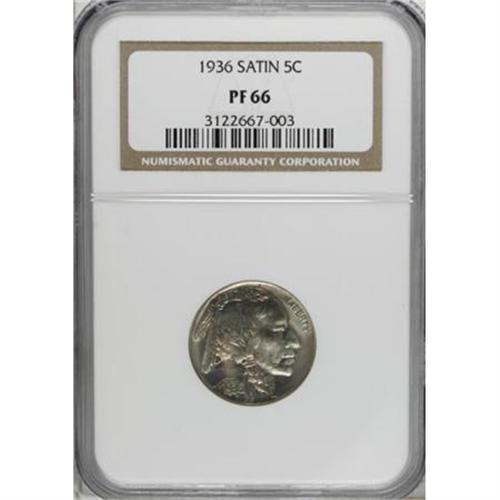 <B>1936 5C Type One--Satin Finish PR66 NGC.</B></I> Hints of peach-gold patina visit the sharply struck devices and satiny fields of this attractive Type One 1936 proof. Gorgeous preservation and eye appeal to match.<BR><I>From The John Stimson, Sr. Collection, Part Two.</B></I><BR><BR><b>Shipping:</b> Coins & Currency (<a target="_blank" href="http://www.heritageauctions.com/common/shipping.php">view shipping information</a>)