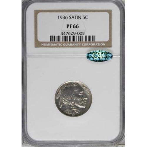 <B>1936 5C Type One--Satin Finish PR66 NGC. CAC.</B></I> An attractive representative of the first official proof Buffalo nickel issue since 1916, boldly impressed with subtly shimmering gold and nickel-gray surfaces. Immensely appealing in every respect.<BR><BR><b>Shipping:</b> Coins & Currency (<a target="_blank" href="http://www.heritageauctions.com/common/shipping.php">view shipping information</a>)