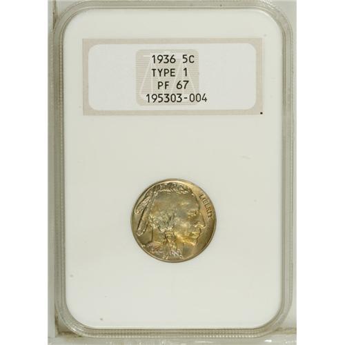 <B>1936 5C Type One--Satin Finish PR67 NGC.</B></I> Though the granularity of the earlier proofs is absent, it is clear the surfaces have more in common with the coins of 1913 to 1916 than the later pieces of 1936 and 1937. Boldly defined and well-preserved with patches of emerald and magenta toning along with the overall golden patina.<BR><I>From The James Paul Collection.</B></I><BR><BR><b>Shipping:</b> Coin/Currency (<a target="_blank" href="http://www.heritageauctions.com/common/shipping.php">view shipping information</a>)