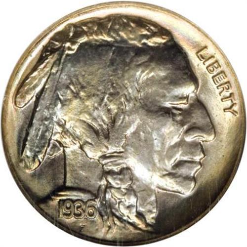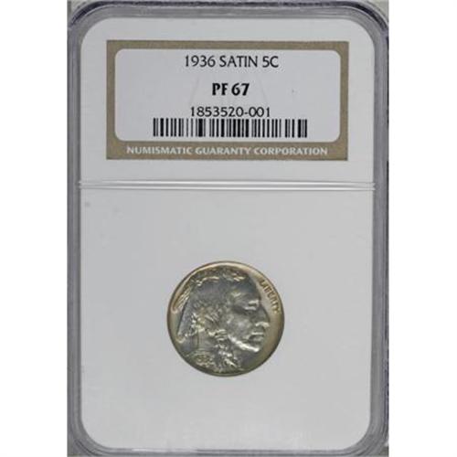 <B>1936 5C Type One--Satin Finish PR67 NGC.</B></I> A medley of iridescent peripheral rainbow color frames ice-blue and yellow-gold centers, which along with the exquisitely struck design elements generates outstanding eye appeal on this Superb Gem proof nickel. Close examination reveals no significant contact marks or serious spotting.<BR><BR><b>Shipping:</b> Coins & Currency (<a target="_blank" href="http://www.heritageauctions.com/common/shipping.php">view shipping information</a>)