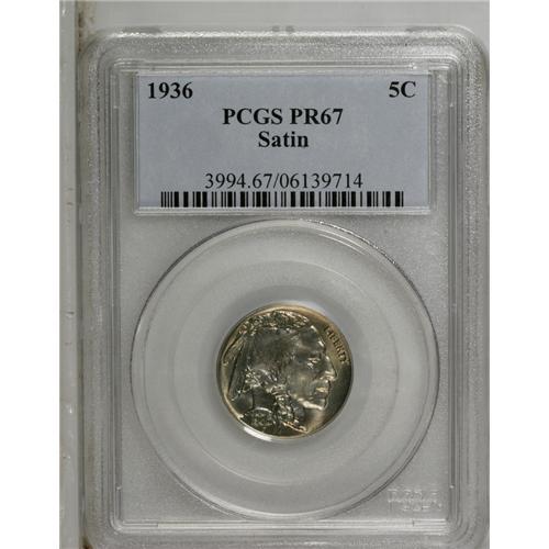 <B>1936 5C Type One--Satin Finish PR67 PCGS.</B></I> A lovely Superb Gem satin proof that has lemon-yellow patina at the periphery and across the center of the buffalo. The remainder of the piece is largely untoned, though hints of ice-blue toning appear in places.<BR><BR><b>Shipping:</b> Coin/Currency (<a target="_blank" href="http://www.heritageauctions.com/common/shipping.php">view shipping information</a>)